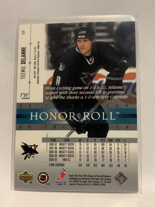 #21 Teemu Selanne San Jose Sharks 2001-02 Upper Deck Hockey Card NHL