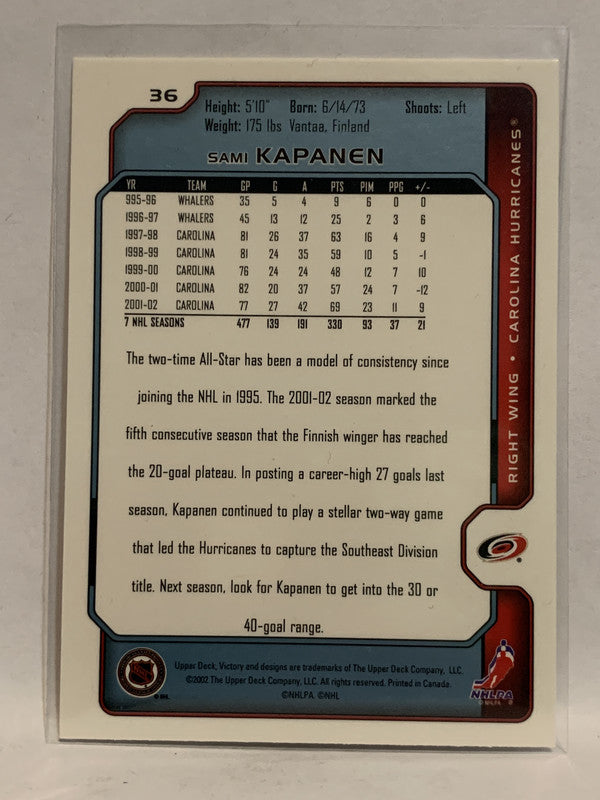 #36 Sami Kapanen Carolina Hurricanes 2002-03 Upper Deck Victory Hockey Card