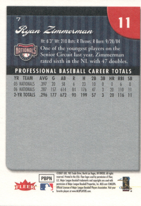 #7 Ryan Zimmerman Washington Nationals 2007 Fleer Baseball Card OB