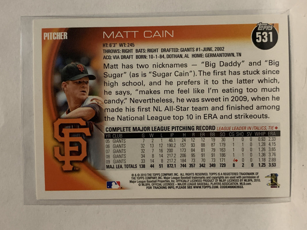 #531 Matt Cain San Francisco Giants 2010 Topps Baseball Card