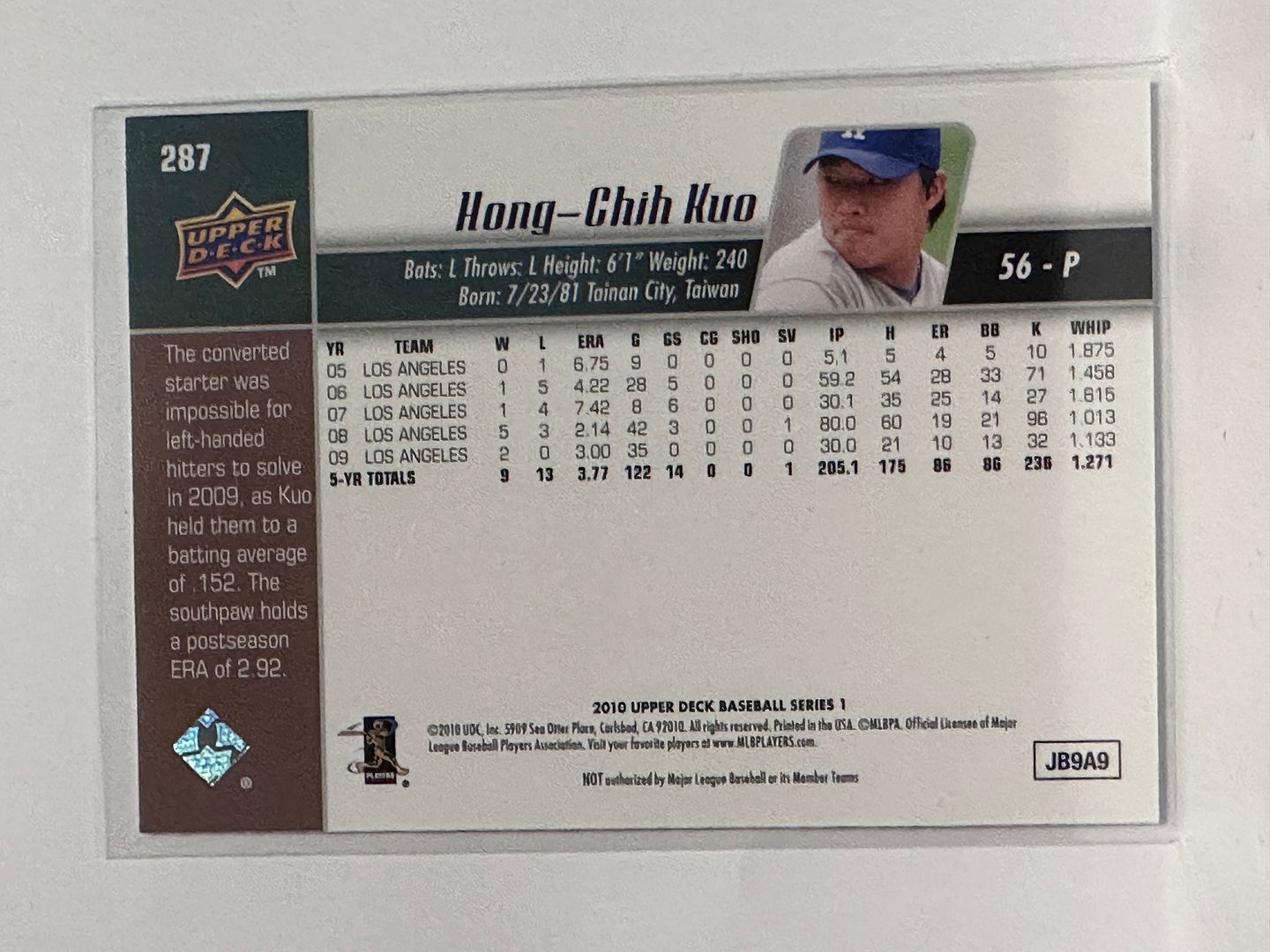 #287 Hong-Chih Kuo Los Angeles Dodgers 2010 Upper Deck Series 1 Baseball