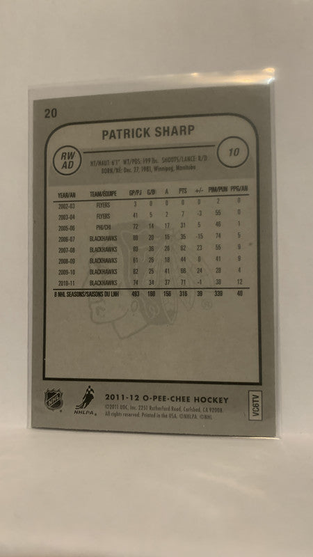 #20 Patrick Sharp Chicago Blackhawks 2011-12 O-Pee-Chee Hockey Card