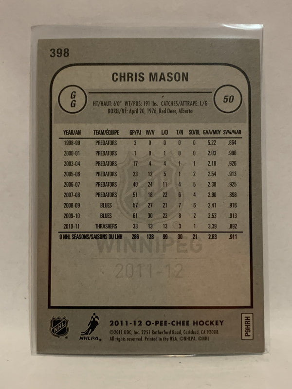 #398 Chris Mason Winnipeg Jets 2011-12 O-PEE-CHEE Hockey Card NHL