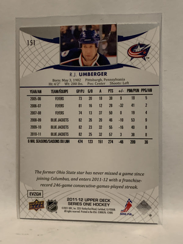 #151 R.J. Umberger Columbus Blue Jackets 2011-12 Upper Deck Series One Hockey Card