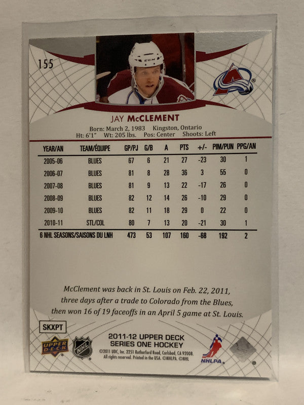 #155 Jay McClement Colorado Avalanche 2011-12 Upper Deck Series One Hockey Card