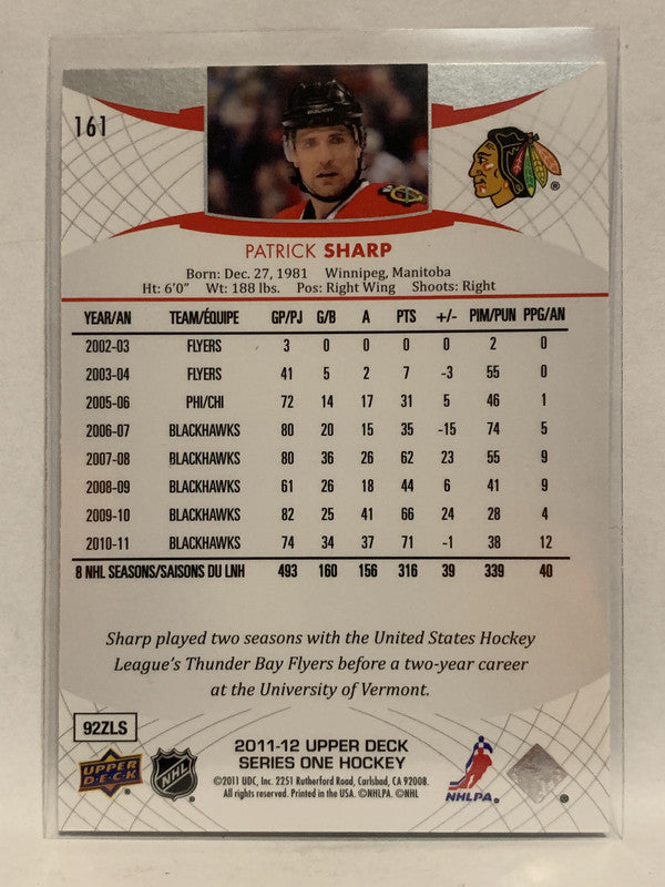 #161 Patrick Sharp Chicago Blackhawks 2011-12 Upper Deck Series One Hockey Card NHL