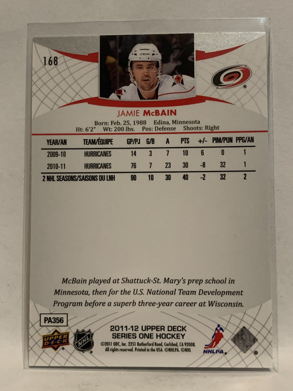 #168 Jamie McBain Carolina Hurricanes 2011-12 Upper Deck Series One Hockey Card