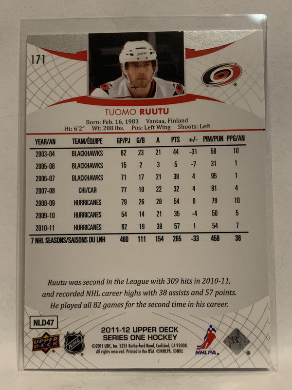 #171 Tuomo Ruutu Carolina Hurricanes 2011-12 Upper Deck Series One Hockey Card