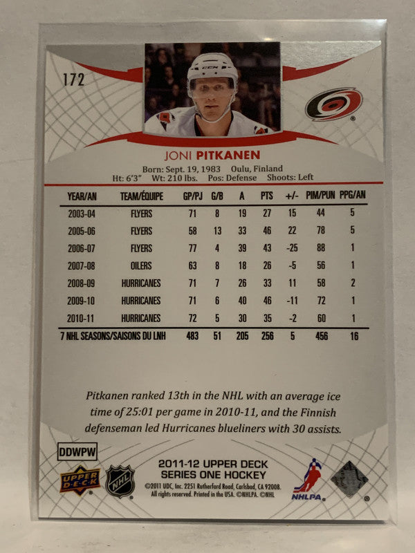 #172 Joni Pitkanen Carolina Hurricanes 2011-12 Upper Deck Series One Hockey Card