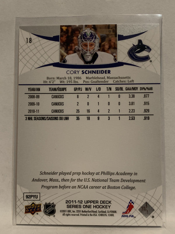 #18 Cory Schneider Vancouver Canucks 2011-12 Upper Deck Series One Hockey Card