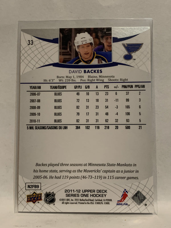 #33 David Backes St Louis Blues 2011-12 Upper Deck Series One Hockey Card