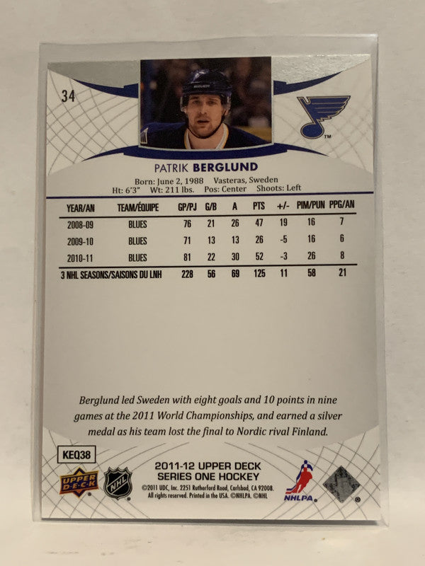 #34 Patrik Berglund St Louis Blues 2011-12 Upper Deck Series One Hockey Card