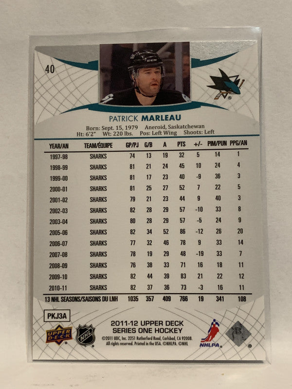 #40 Patrick Marleau San Jose Sharks 2011-12 Upper Deck Series One Hockey Card