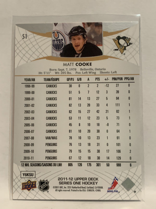 #51 Matt Cooke Pittsburgh Penguins 2011-12 Upper Deck Series One Hockey Card