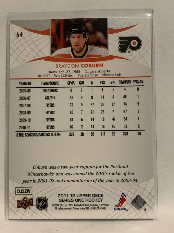 #64 Brayson Coburn Philadelphia Flyers 2011-12 Upper Deck Series One Hockey Card