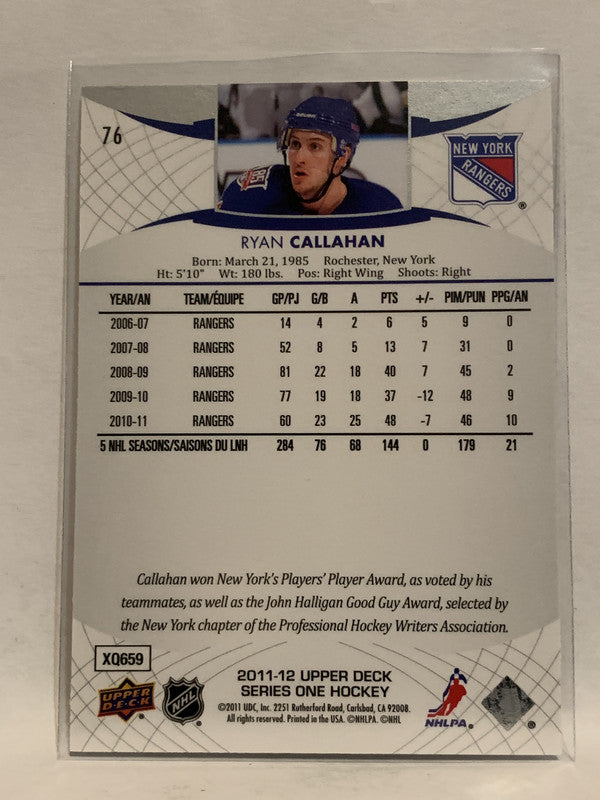 #76 Ryan Callahan New York Rangers 2011-12 Upper Deck Series One Hockey Card