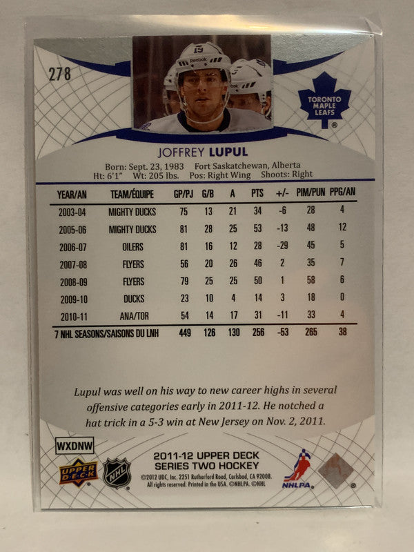 #278 Joffrey Lupul Toronto Maple Leafs 2011-12 Upper Deck Series Two Hockey Card NHL