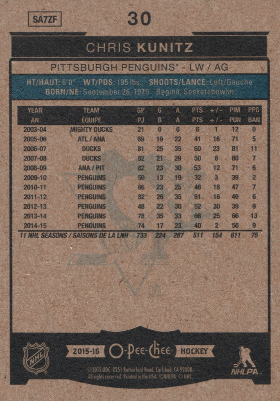 #30 Chris Kunitz Pittsburgh Penguins 2015-16 O-Pee-Chee Hockey Card OI