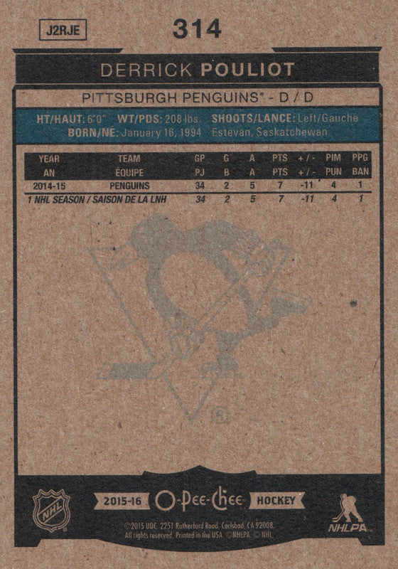 #314 Derrick Pouliot Pittsburgh Penguins 2015-16 O-Pee-Chee Hockey Card OI