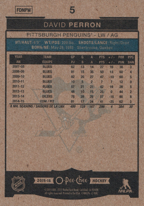 #5 David Perron Pittsburgh Penguins 2015-16 O-Pee-Chee Hockey Card OI