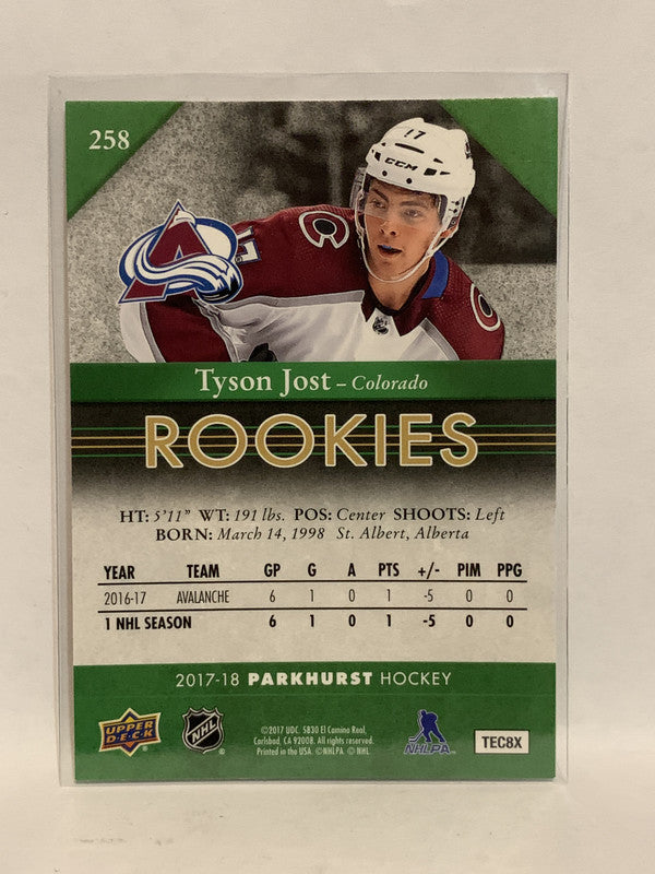 #258 Tyson Jost Rookie Colorado Avalanche 2017-18 Parkhurst Hockey Card