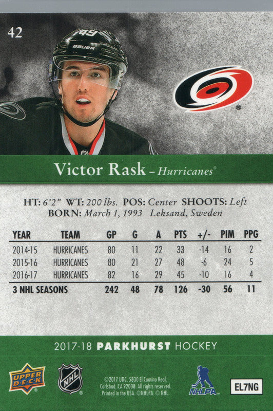 #42 Victor Rask Carolina Hurricanes 2017-18 Parkhurst Hockey Card OH