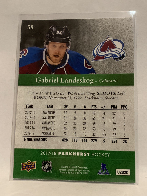 #58 Gabriel Landeskog Colorado Avalanche 2017-18 Parkhurst Hockey Card NHL