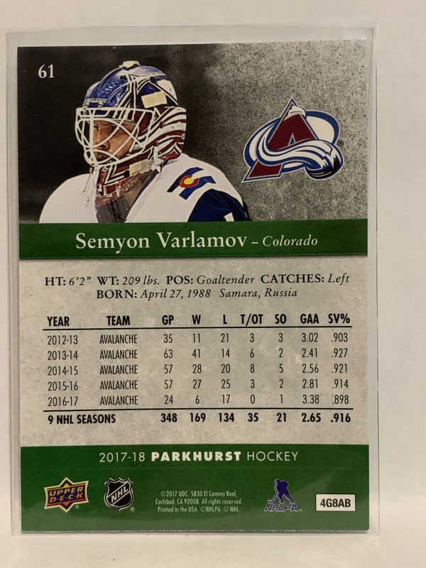 #61 Samyon Varlamov Colorado Avalanche 2017-18 Parkhurst Hockey Card