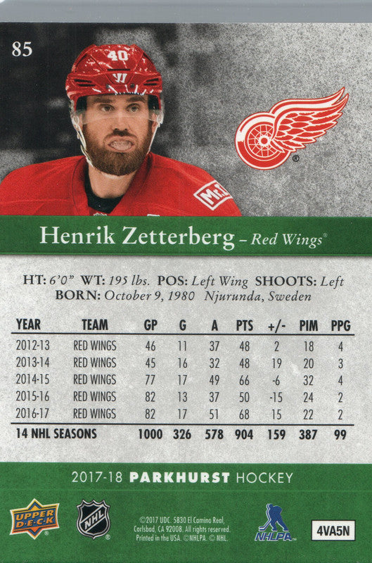 #85 Henrik Zetterberg Detroit Red Wings 2017-18 Parkhurst Hockey Card OH