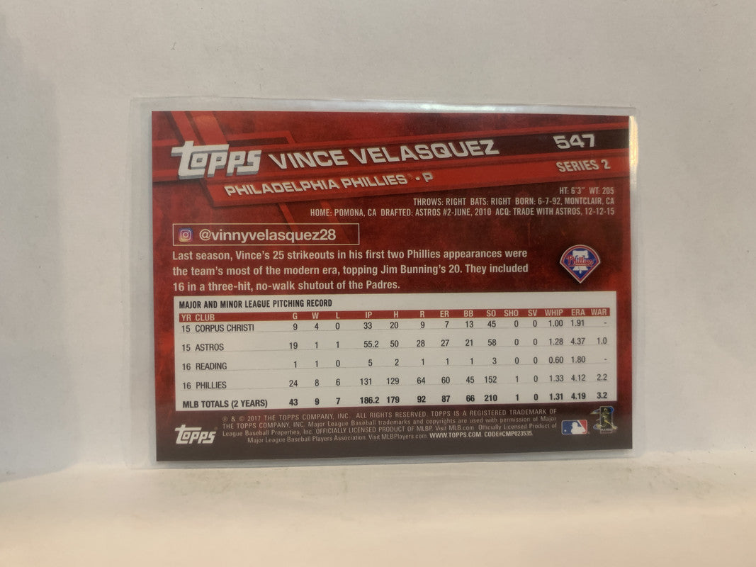 #547 Vince Velasquez Philadelphia Phillies 2017 Topps Series 2 Baseball Card MZ2