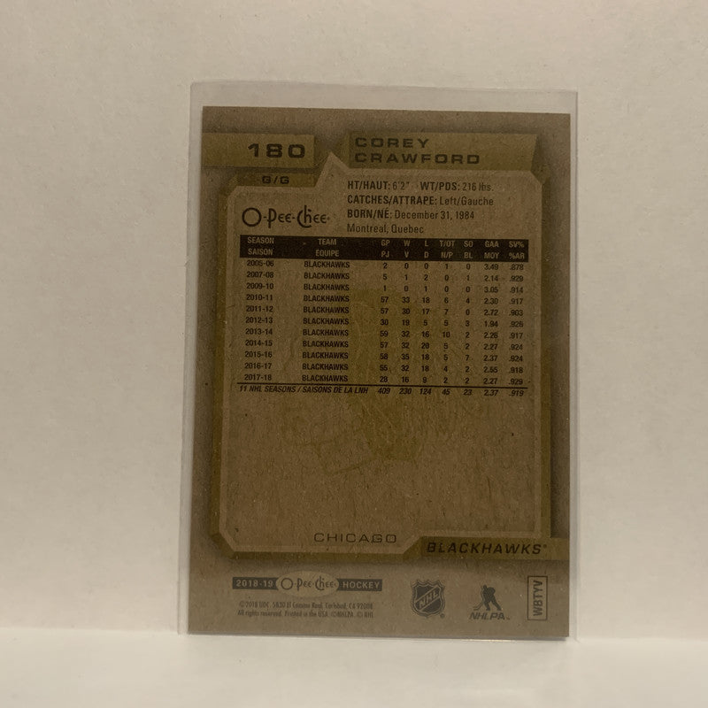 #180 Corey Crawford Chicago Blackhawks 2018-19 O-Pee-Chee Hockey Card JK