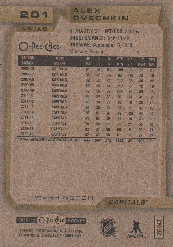 #201 Alex Ovechkin Washington Capitals 2018-19 O-Pee-Chee Hockey Card OI