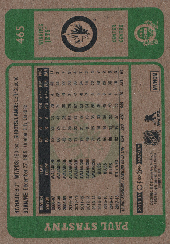 #465 Paul Stastny Winnipeg Jets 2018-19 O-Pee-Chee Hockey Card OJ