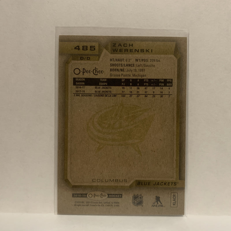 #485 Zach Werenski Columbus Blue Jackets 2018-19 O-Pee-Chee Hockey Card JQ