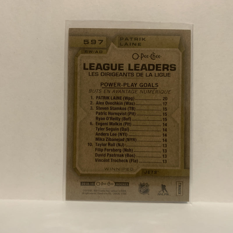 #597 Patrik Laine Winnipeg Jets League Leaders 2018-19 O-Pee-Chee Hockey Card JQ