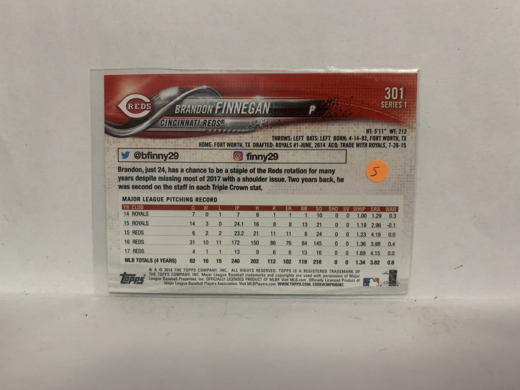 #301 Brandon Finnegan Cincinnati Reds 2018 Topps Series 1 Baseball Card NO