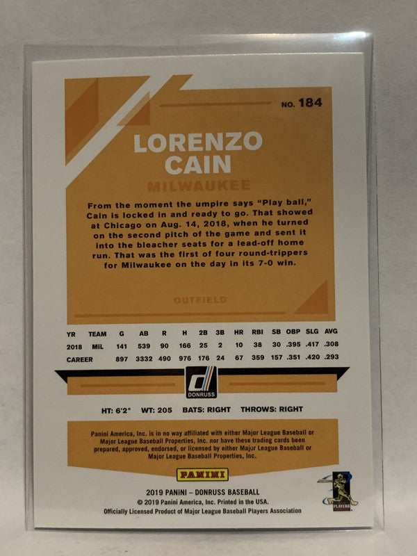 #184 Lorenzo Cain Milwaukee Brewers 2019 Donruss Baseball Card