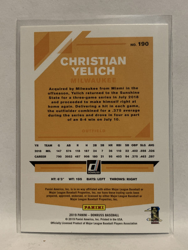 #190 Christian Yelich Milwaukee Brewers 2019 Donruss Baseball Card