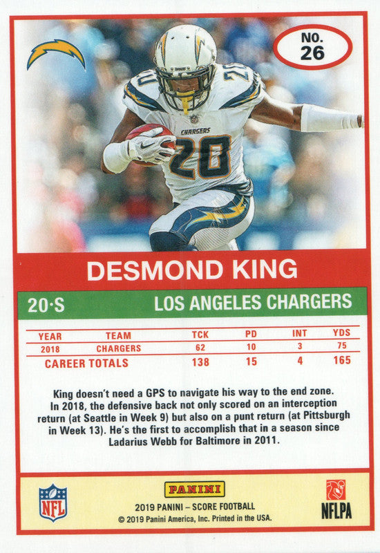 #26 Desmond King Los Angeles Chargers 2019 Score Football Card