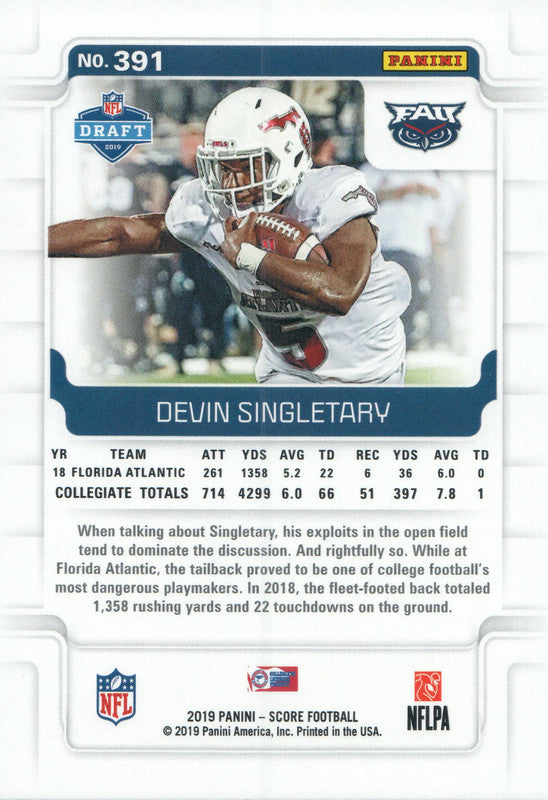 #391 Devin Singletary Rookie Florida Atlantic University 2019 Score Football Card