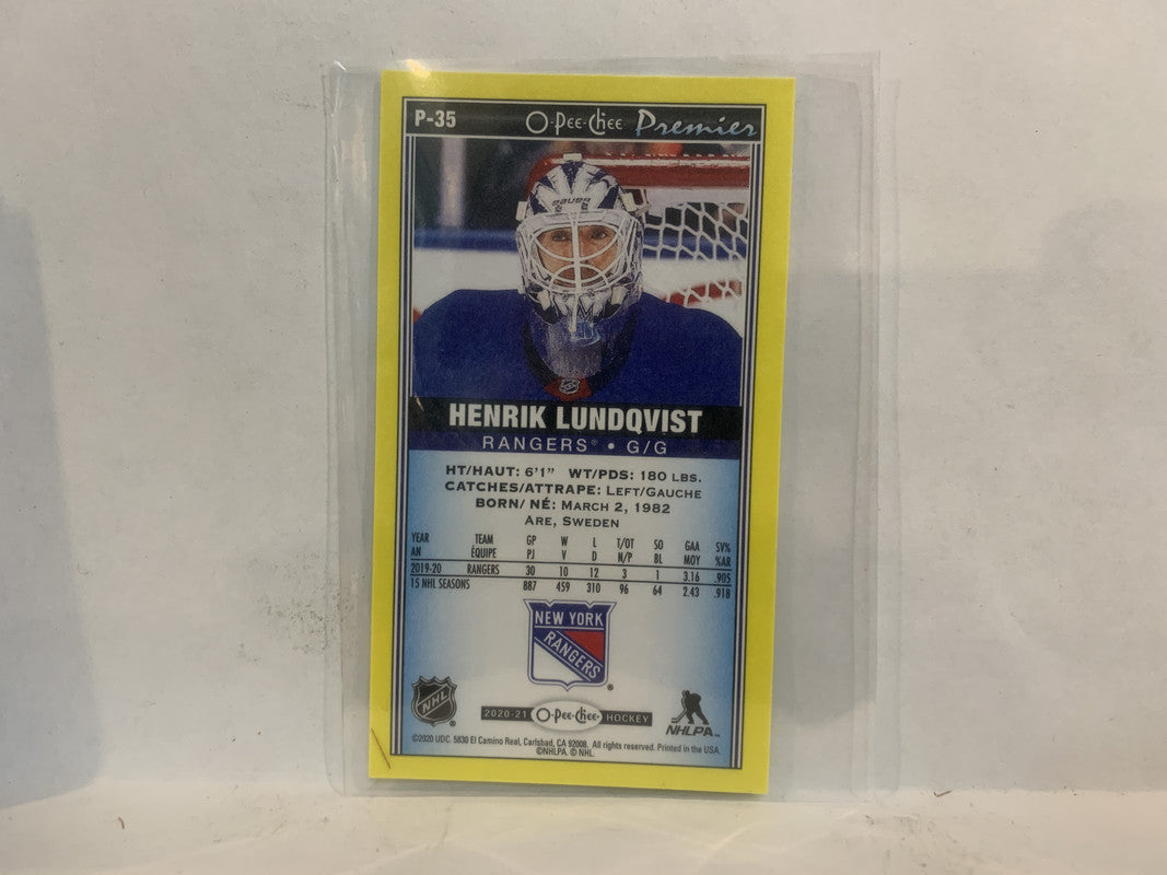 P-35 Henrik Lundqvist Premier Yellow New York Rangers 2020-21 O-PEE-CHEE Hockey Card MP