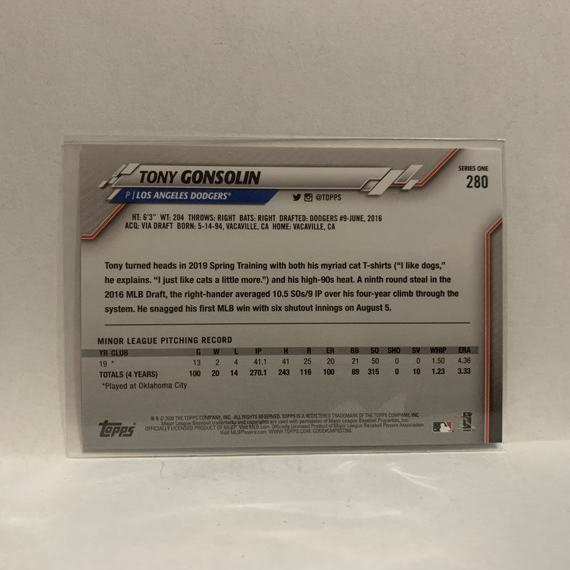 #280 Tony Gonsolin Rookie Los Angeles Dodgers 2020 Topps Series 1 Baseball Card IA