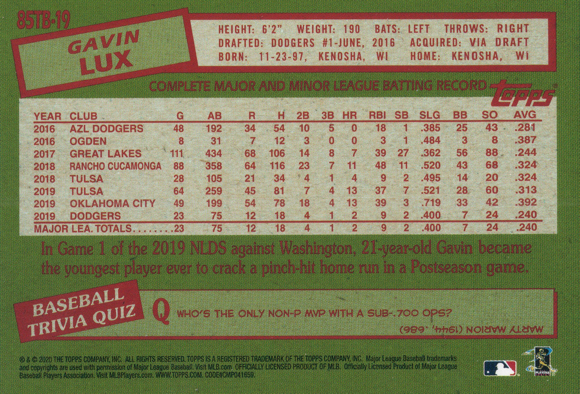 85TB-19 Gavin Lux Rookie Los Angeles Dodgers 2020 Topps Update Baseball Card