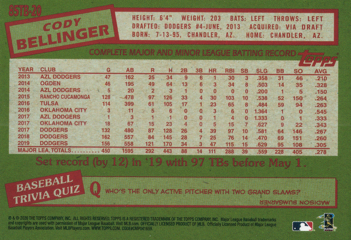 85TB-20 Cody Bellinger Los Angeles Dodgers 2020 Topps Update Baseball Card