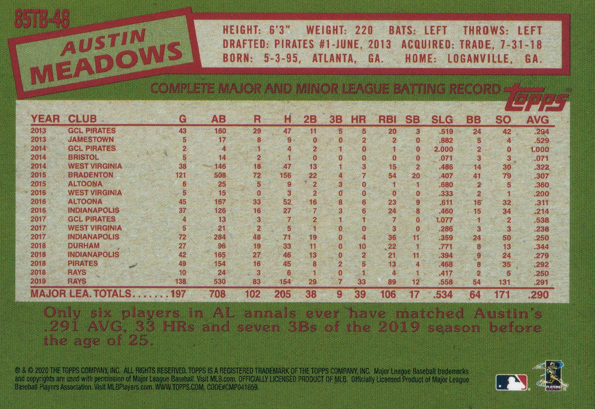 85TB-48 Austin Meadows Tampa Bay Rays 2020 Topps Update Baseball Card