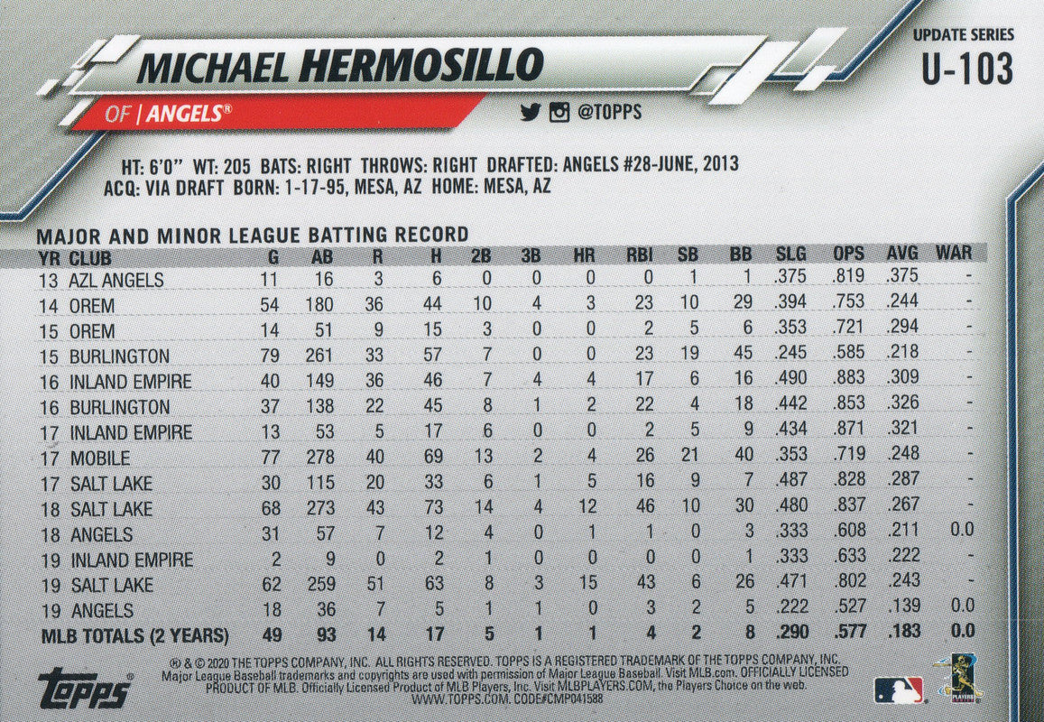 U-103 Michael Hermosillo Los Angeles Angels 2020 Topps Update Baseball Card