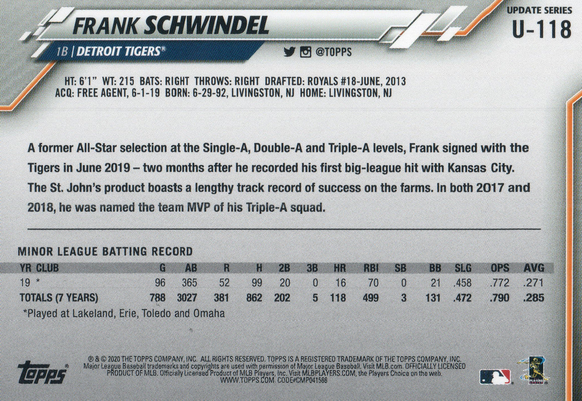 U-118 Frank Schwindel Rookie Detroit Tigers 2020 Topps Update Baseball Card