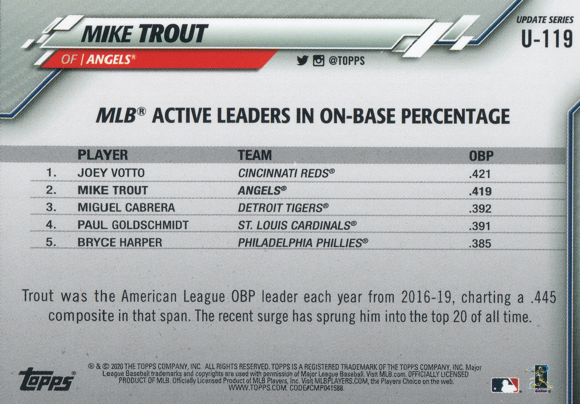 U-119 Mike Trout MLB Active Leaders Los Angeles Angels 2020 Topps Update Baseball Card