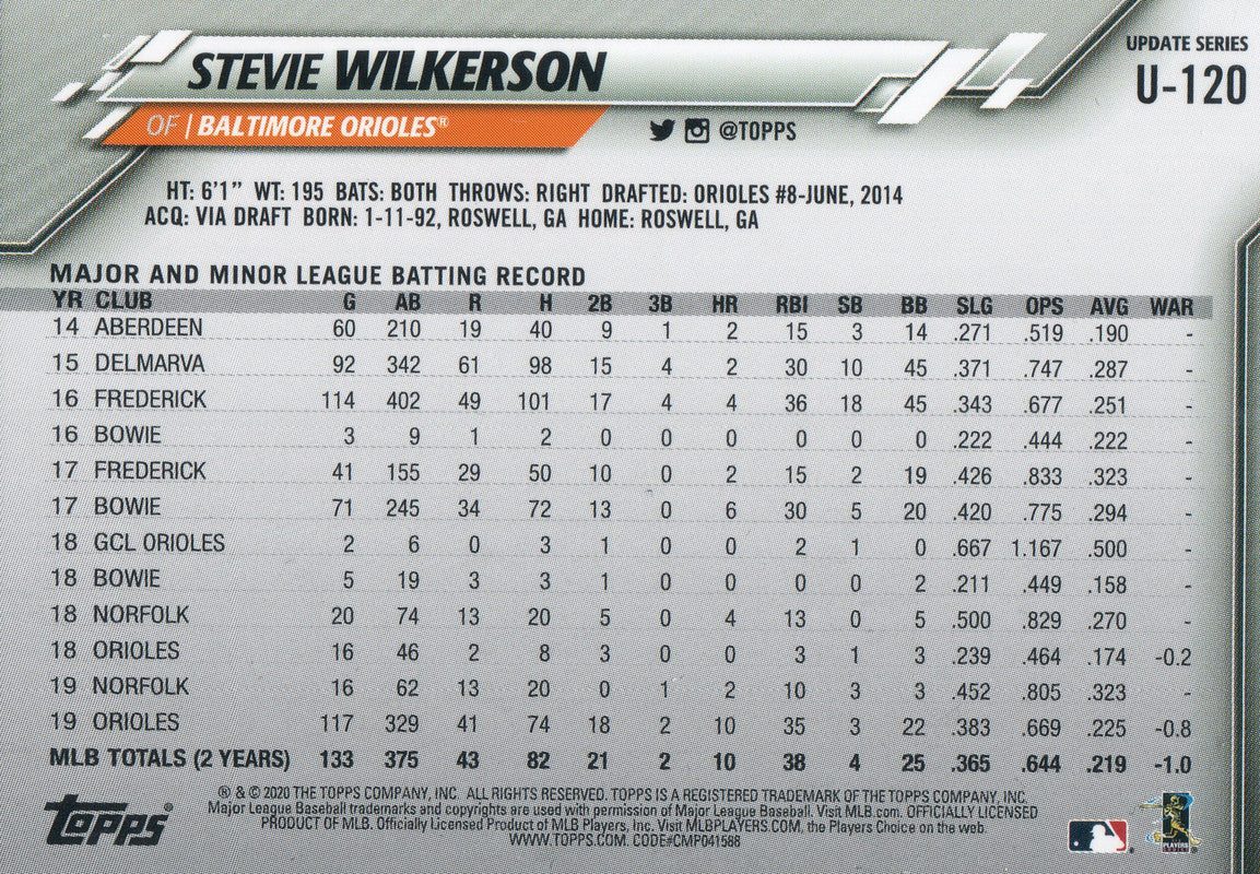 U-120 Stevie Wilkerson Baltimore Orioles 2020 Topps Update Baseball Card
