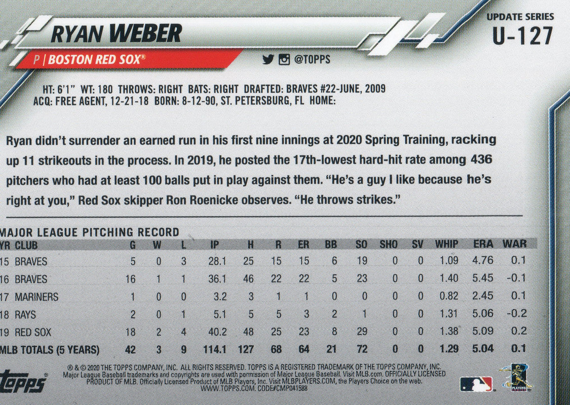 U-127 Ryan Weber Boston Red Sox 2020 Topps Update Baseball Card